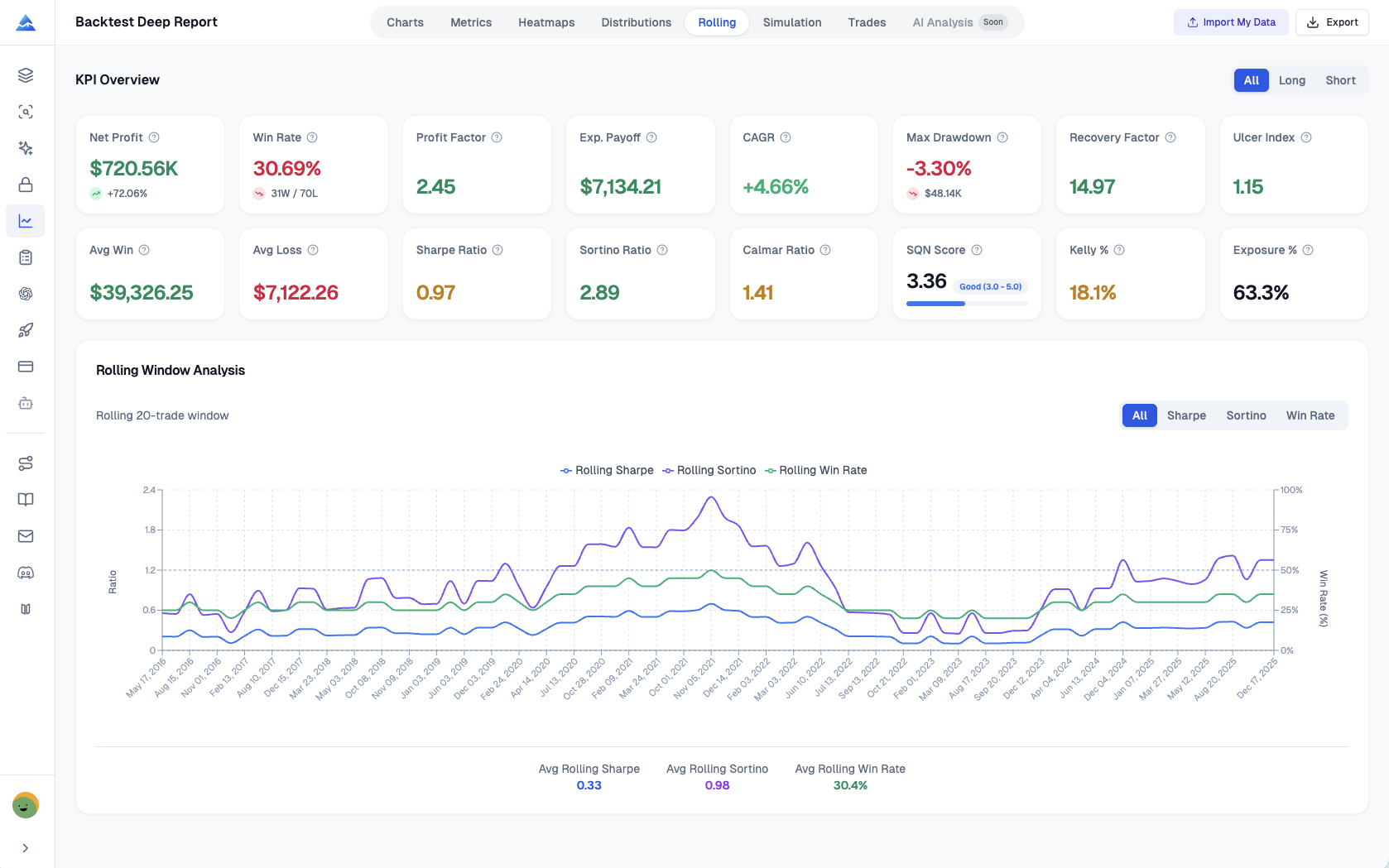 - Rolling win rate, rolling profit factor, and rolling Sharpe across configurable window sizes