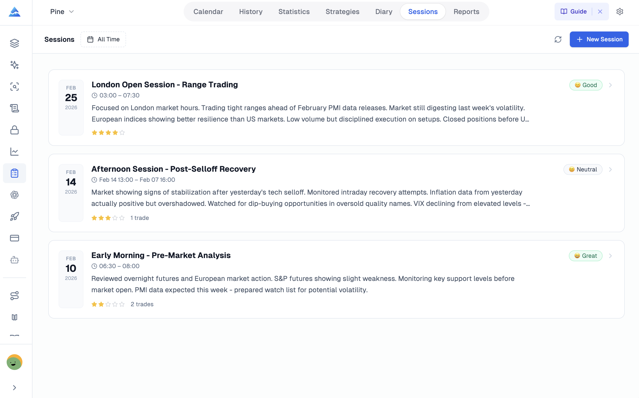 The Trading Journal is a comprehensive trade tracking and analysis tool. Log every trade, tag it with a strategy, review it with diary notes, break down performance by session, and generate portfolio reports — all in one place. Built for traders who want to identify what's working and eliminate what isn't.