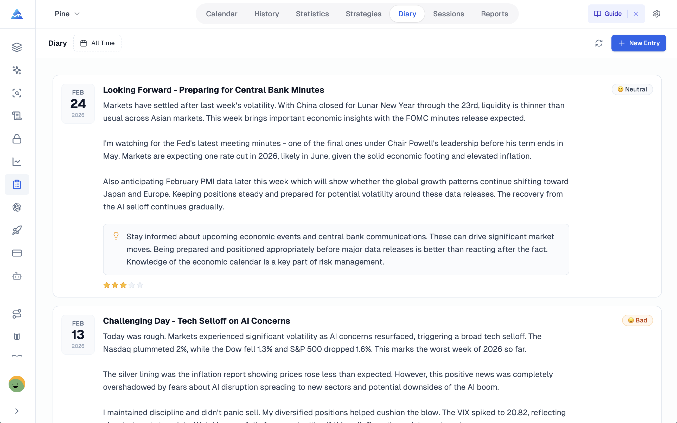 Track, analyze, and improve your trades with Pineify's Trading Journal — featuring a visual trade editor, analytics dashboard, strategy tagging, diary, session reviews, and portfolio reports.